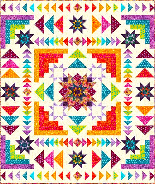 The Hyperion quilt by Leslie Ryan of Blooming Boldly Designs is a modern twist on tradition. Hyperion combines the classic charm of stars, flying geese, and log cabin blocks with a modern flair. The vibrant Polka Pop Elemental Batiks from Riley Blake make this quilt a feast for the eyes. The finished size is 64 1/2" x 76 1/2" -- perfect for the back of the couch or hanging on your wall.